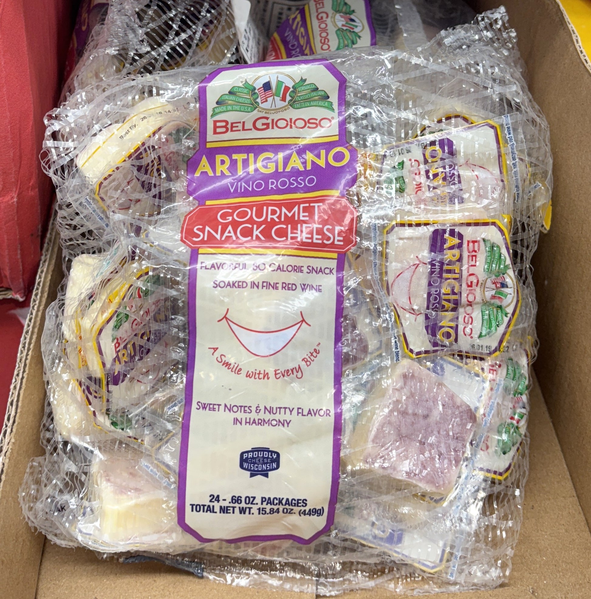 "Treat yourself to a sophisticated snack! This Wisconsin-made Artigiano cheese is soaked in fine red wine, giving it a rich purple rind and sweet nutty flavor. These 24 individual packs are the ultimate grab-and-go indulgence for your lunchbox or your nightly glass of vino."