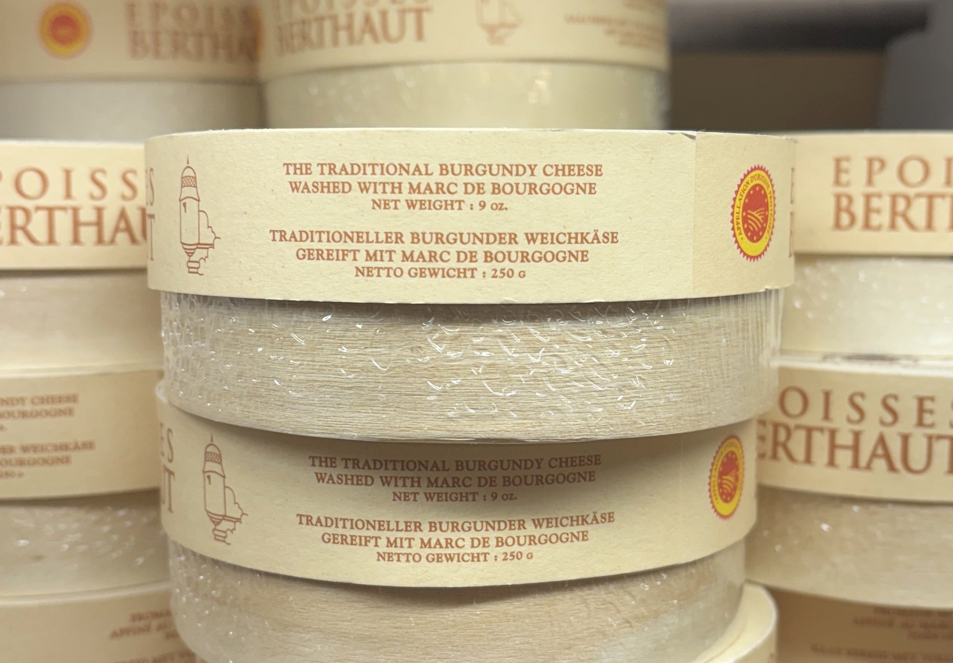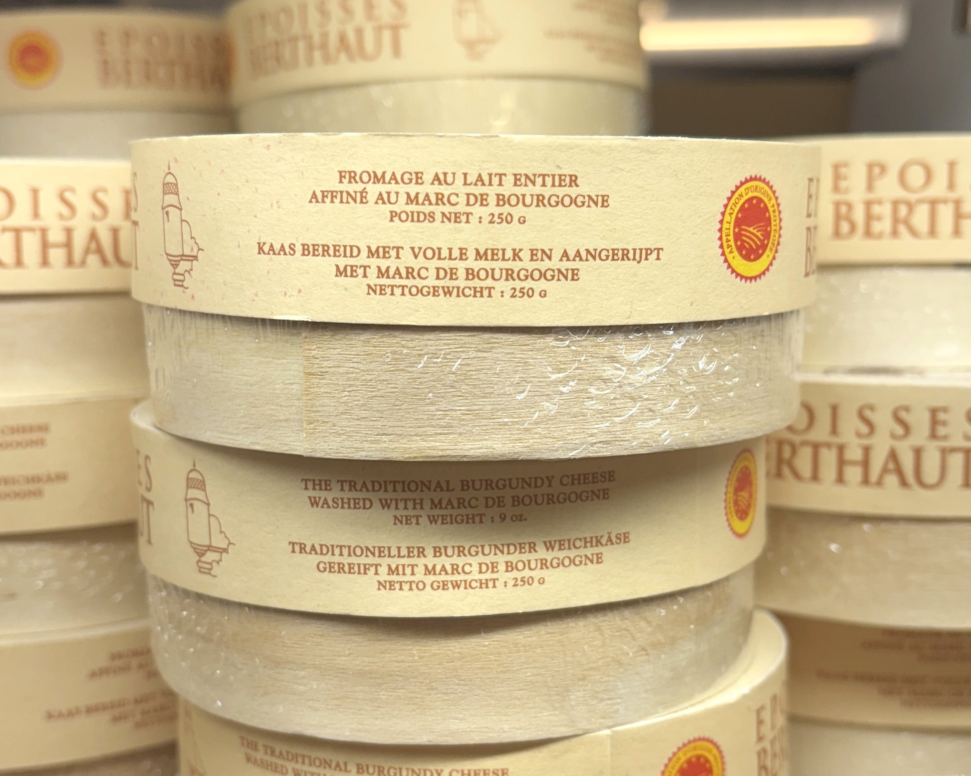 Prepare for one of the most famous and fragrant cheeses in the world! This is Époisses, a classic French washed-rind cheese from the Burgundy region, made by the esteemed Berthaut company under the strict AOP (Protected Designation of Origin) standards.