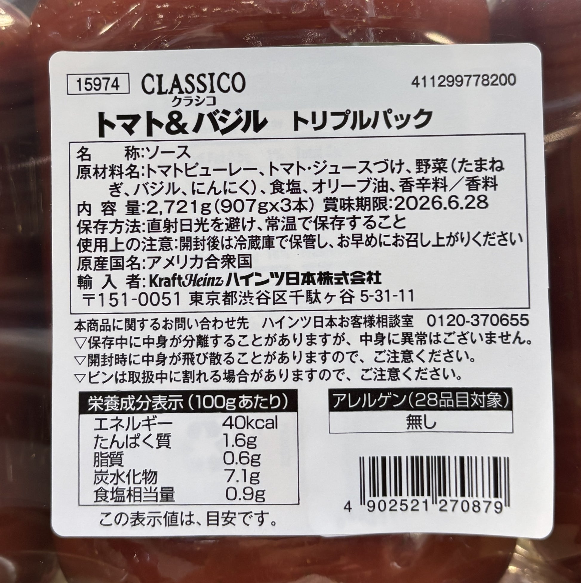 クラシコ トマト&バジル パスタソース (3 glass jars)