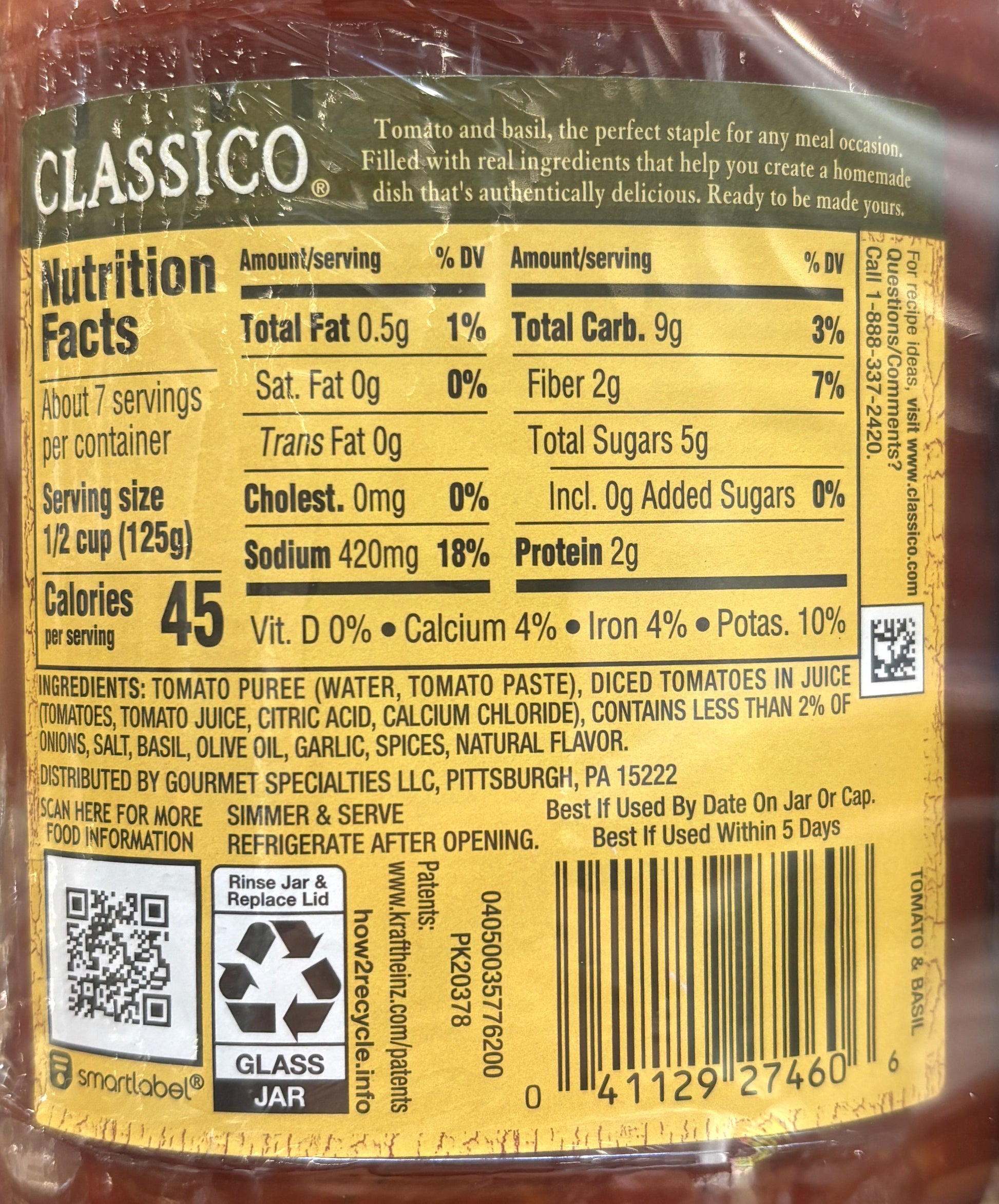 Diced Tomatoes, Tomato Puree (Water, Tomato Paste), Onions, Garlic, Pure Olive Oil, Salt, Basil, Spice.