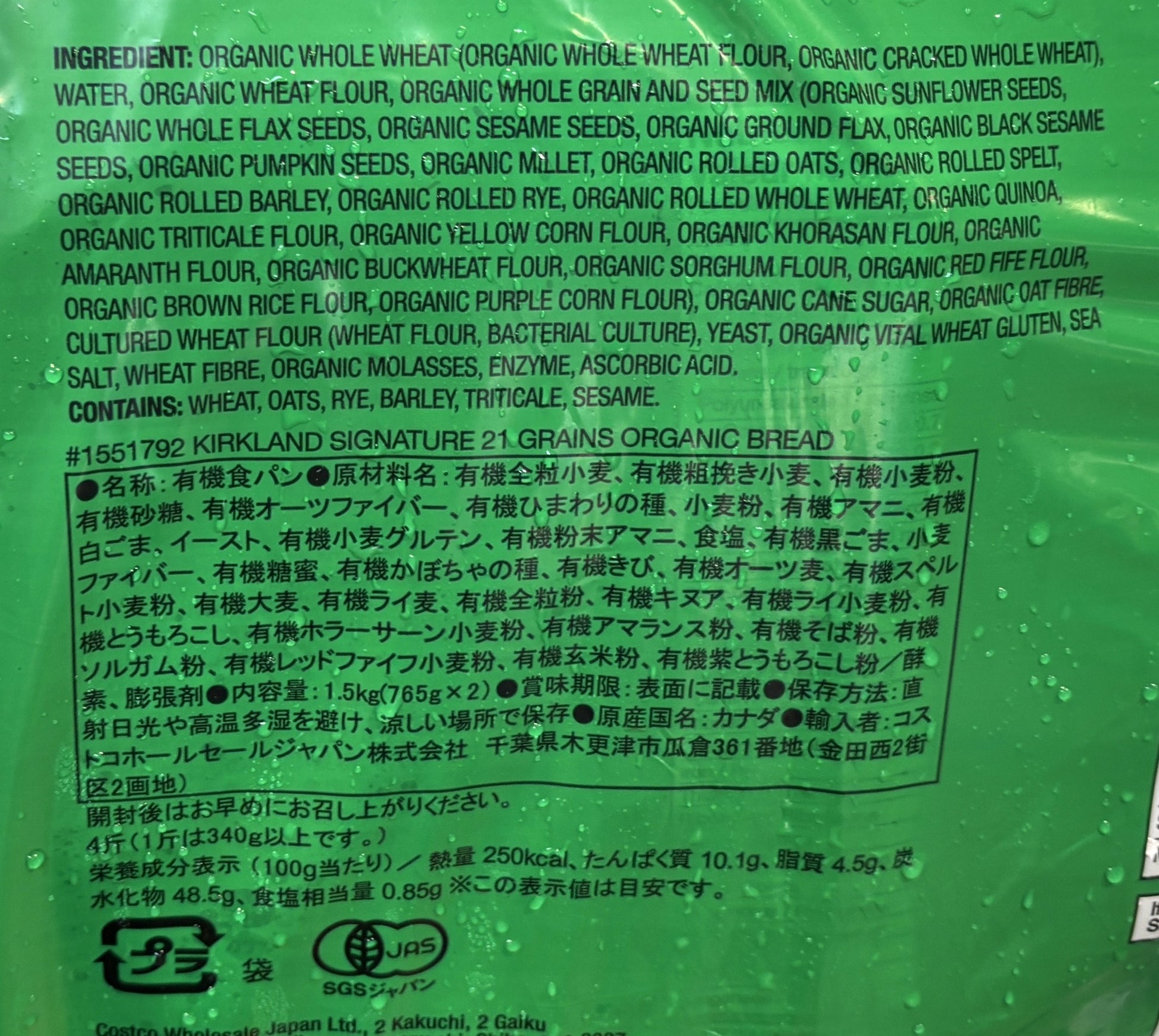 Kirkland Singnature 21穀 オーガニック 食パン 765-g x 2-ct