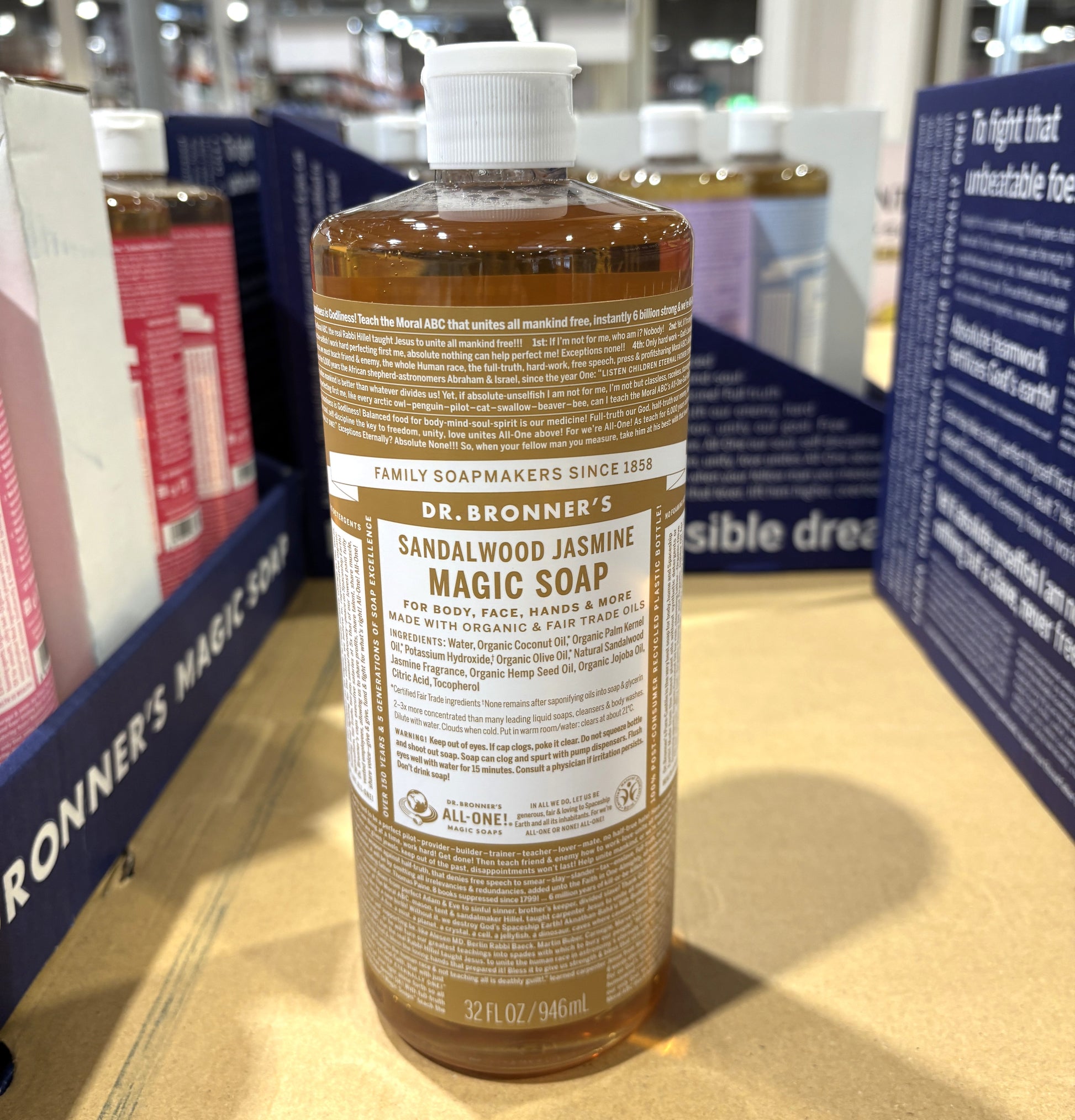 全米売上No.1のオーガニックソープ「ドクターブロナー マジックソープ」から、ウッディで優雅な「サンダルウッド&ジャスミン」をご紹介します。**コストコ(Costco)**で大人気の944ml特大サイズは、毎日のケアからお掃除まで、これ1本で魔法のようにこなせる万能アイテムです。