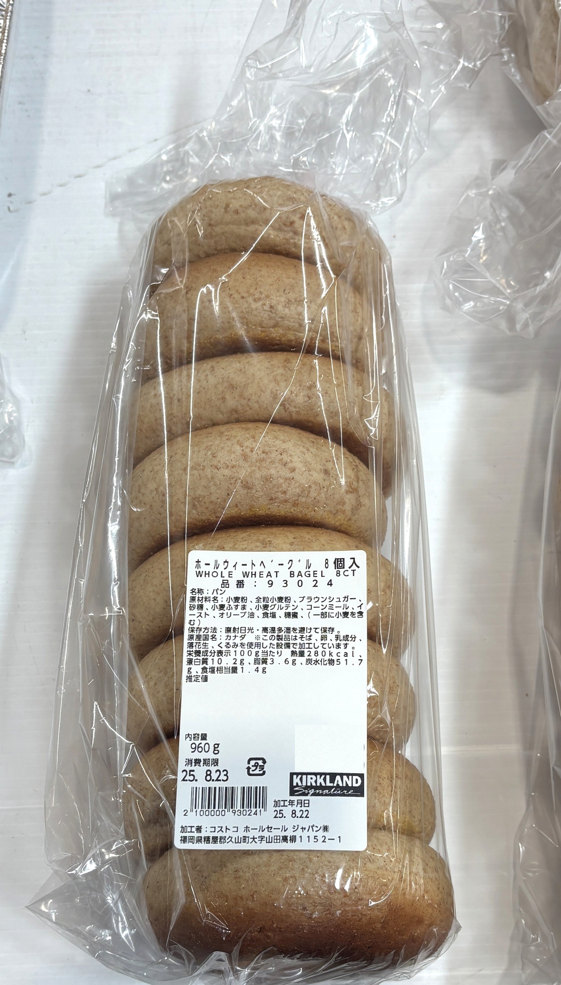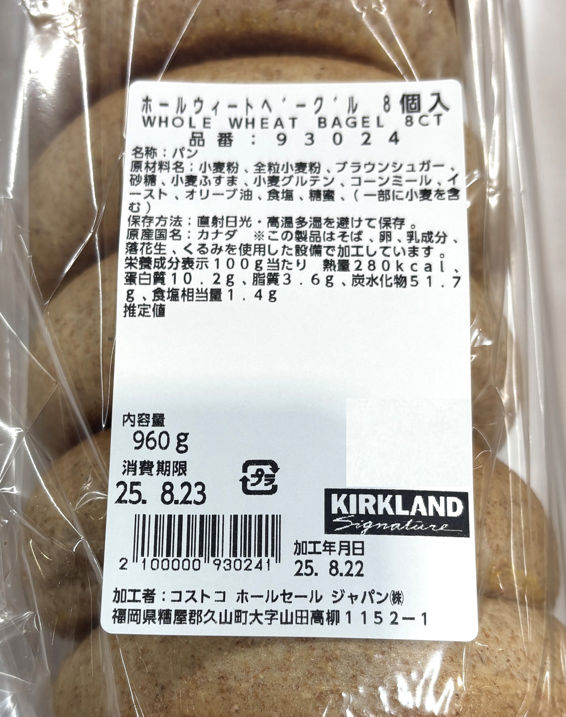 コストコのベーカリーコーナーに並ぶ**「ホール ウィート ベーグル」**は、ずっしりとした重みと、噛むほどに美味しいもちもちの食感が特徴です。ヘルシーな全粒粉を使っているため、毎日の食卓にぴったりです。