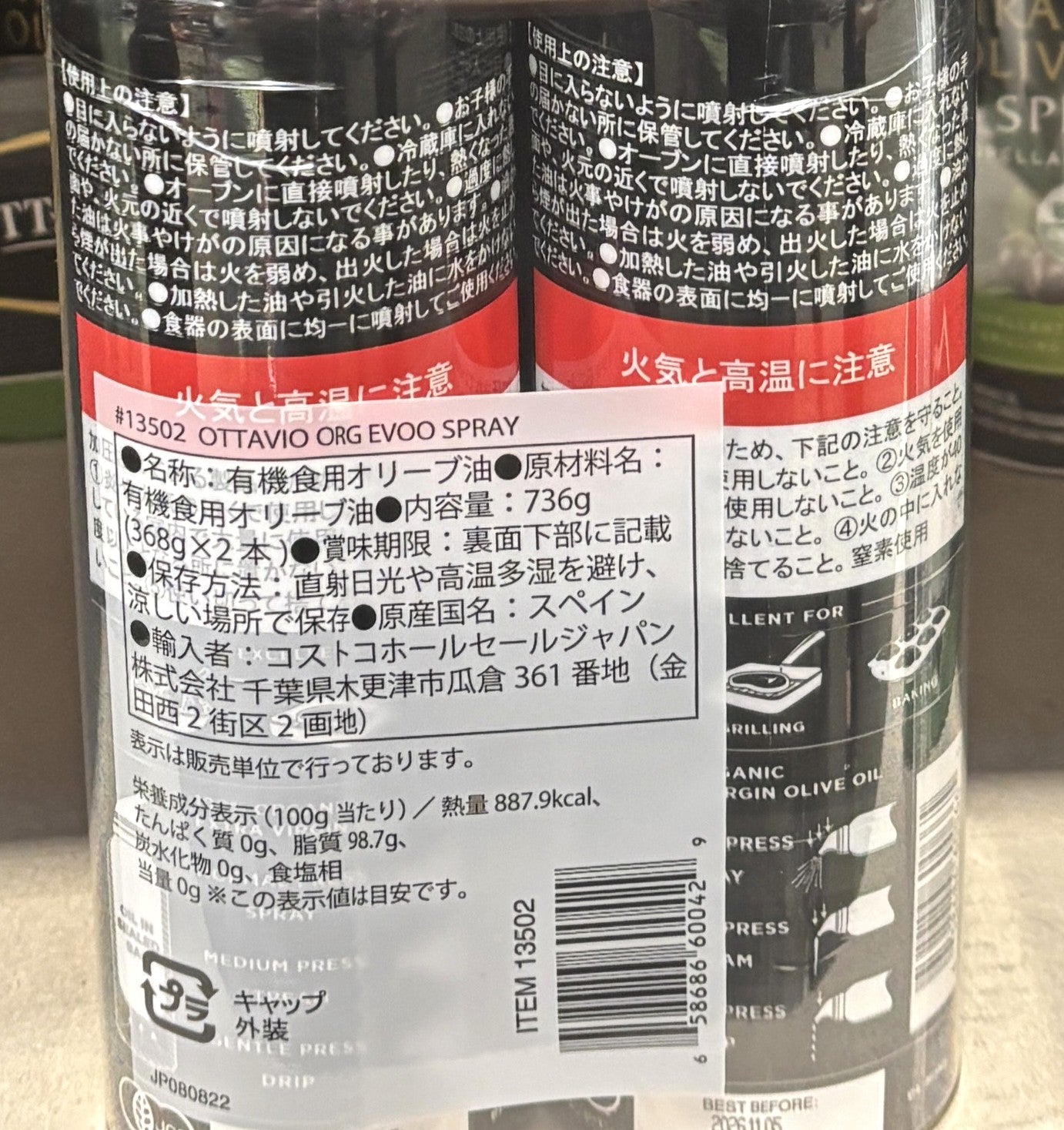 Ottavio オーガニック エクストラバージン オリーブオイル スプレー缶 (368g x 2-ct)