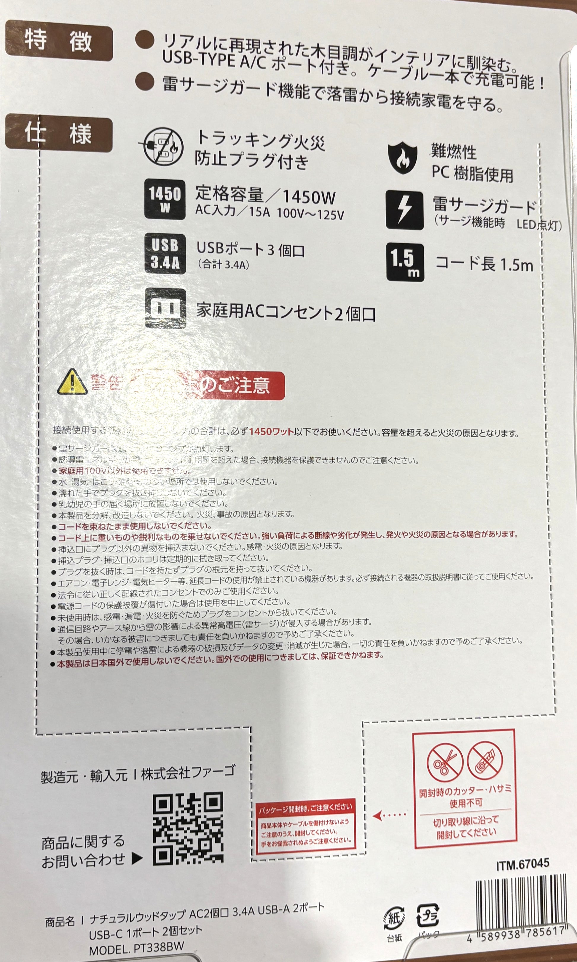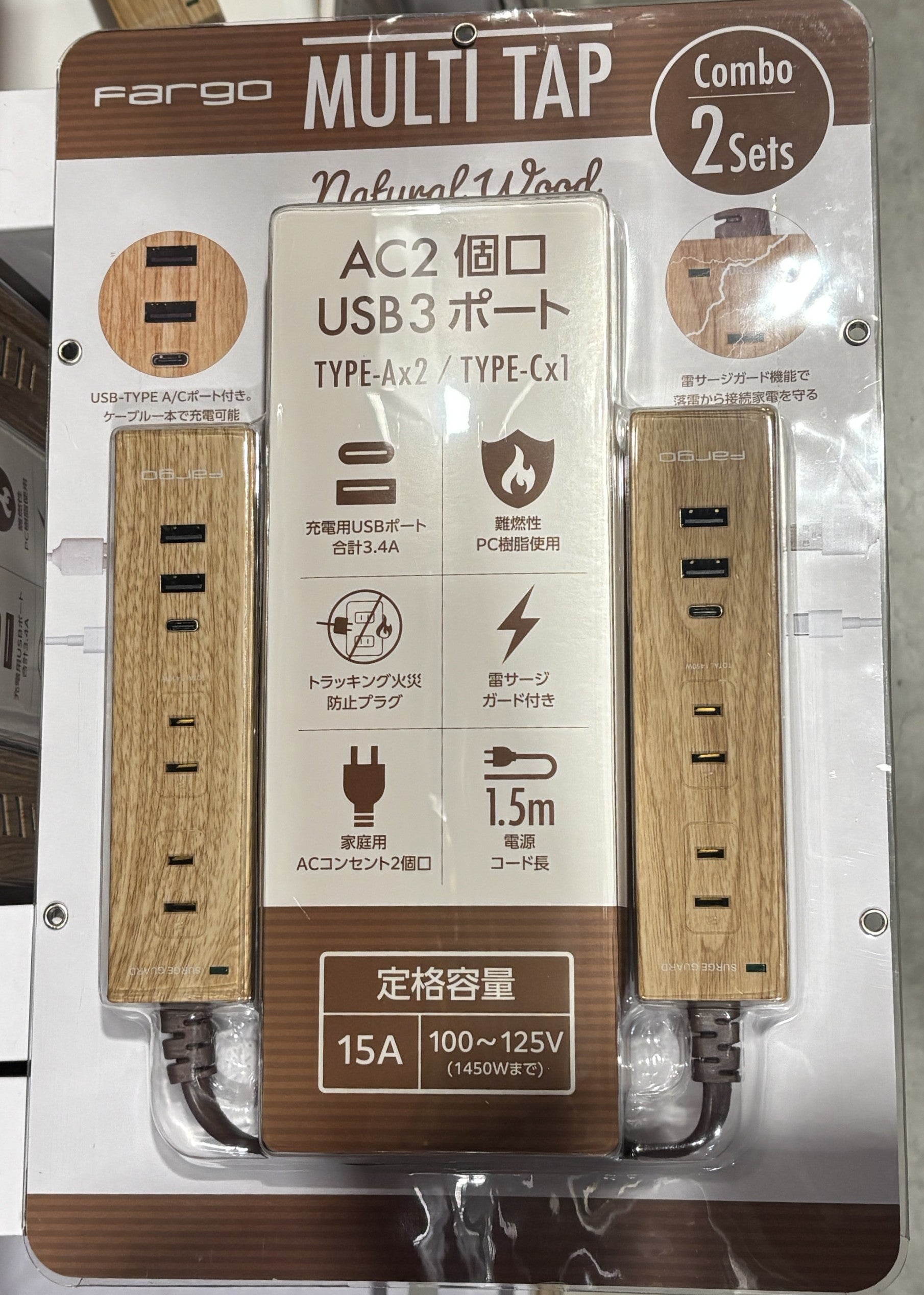 商品名: ナチュラルウッドタップ AC2個口 3.4A USB-A 2ポート USB-C 1ポート 2個セット