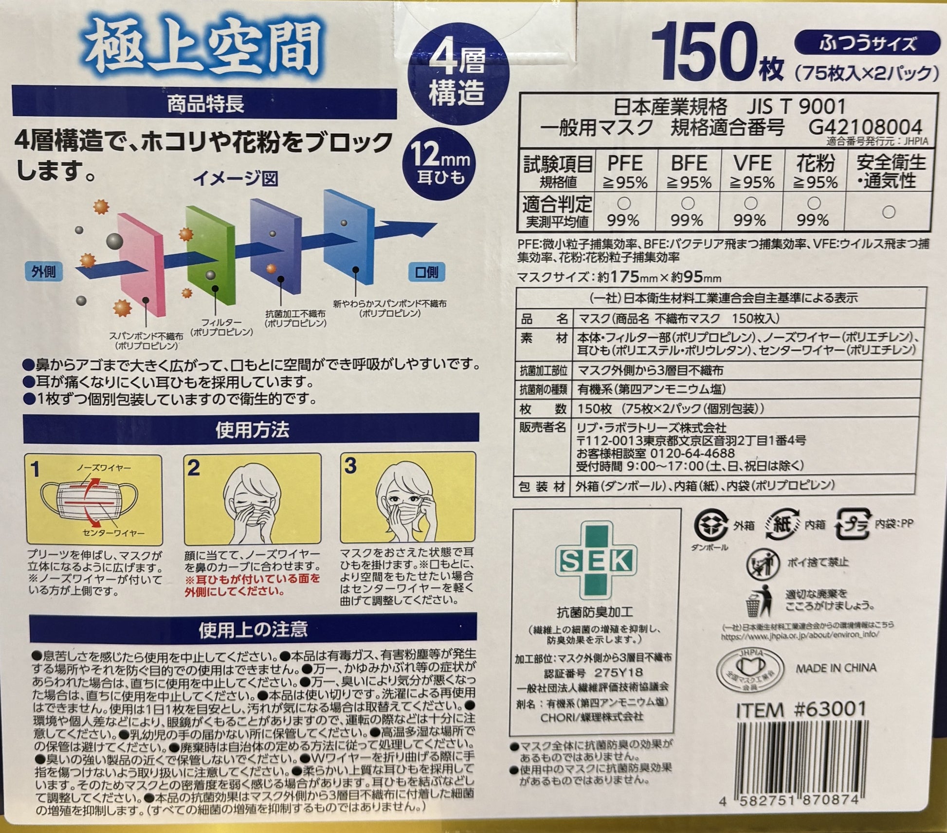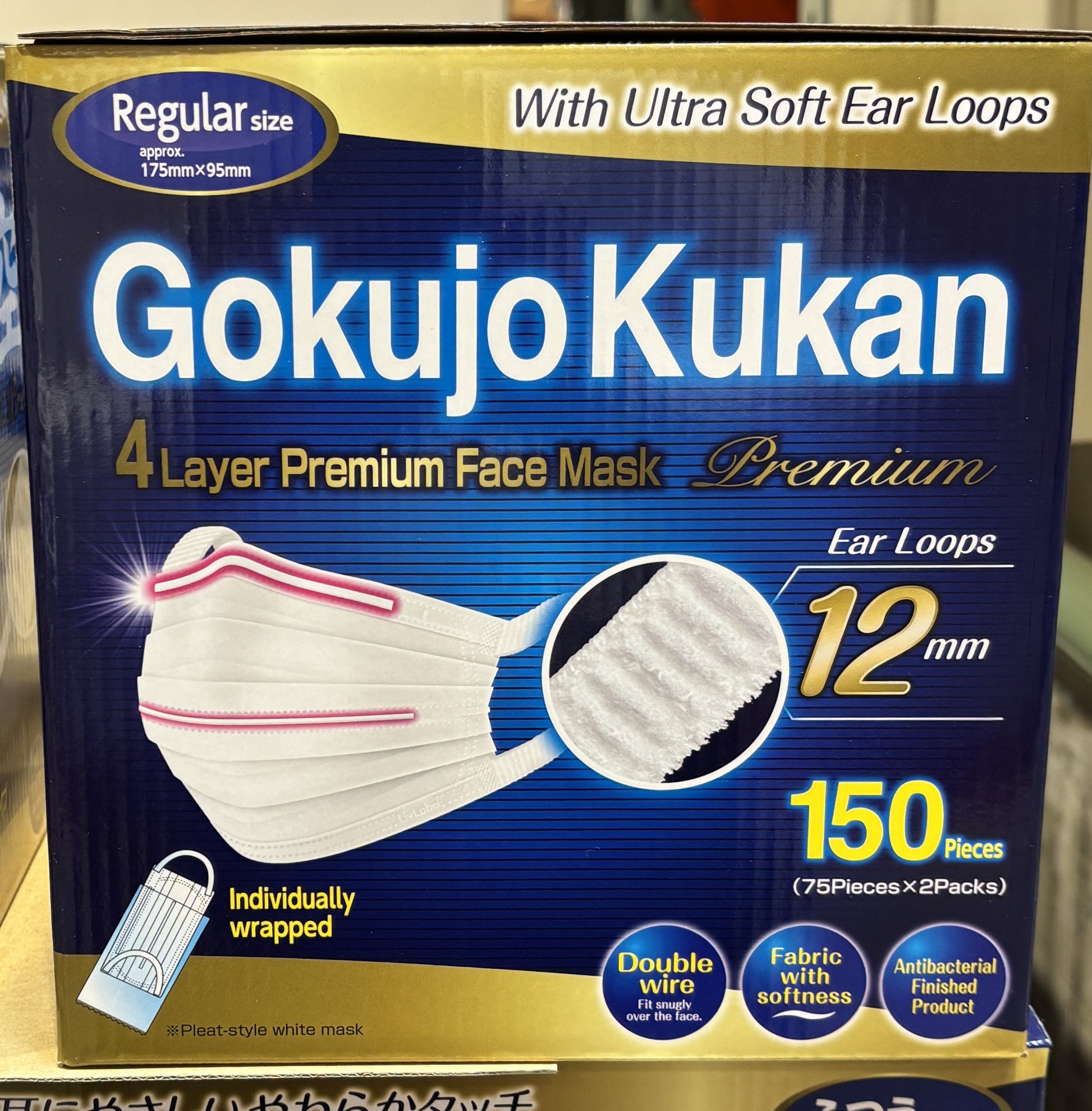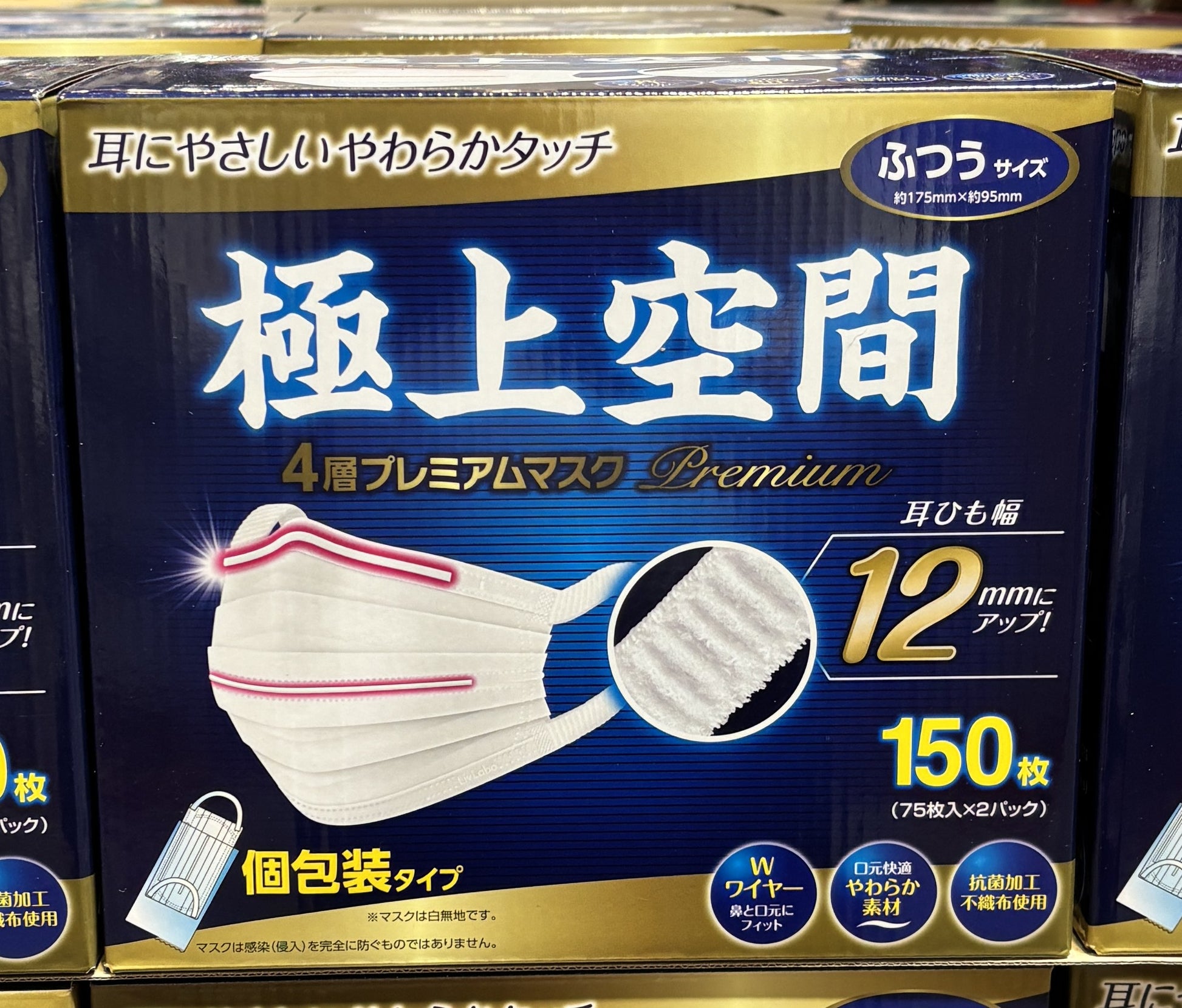 極上空間 12mm耳紐 4層プレミアムマスク 150枚 ふつうサイズ 個包装
